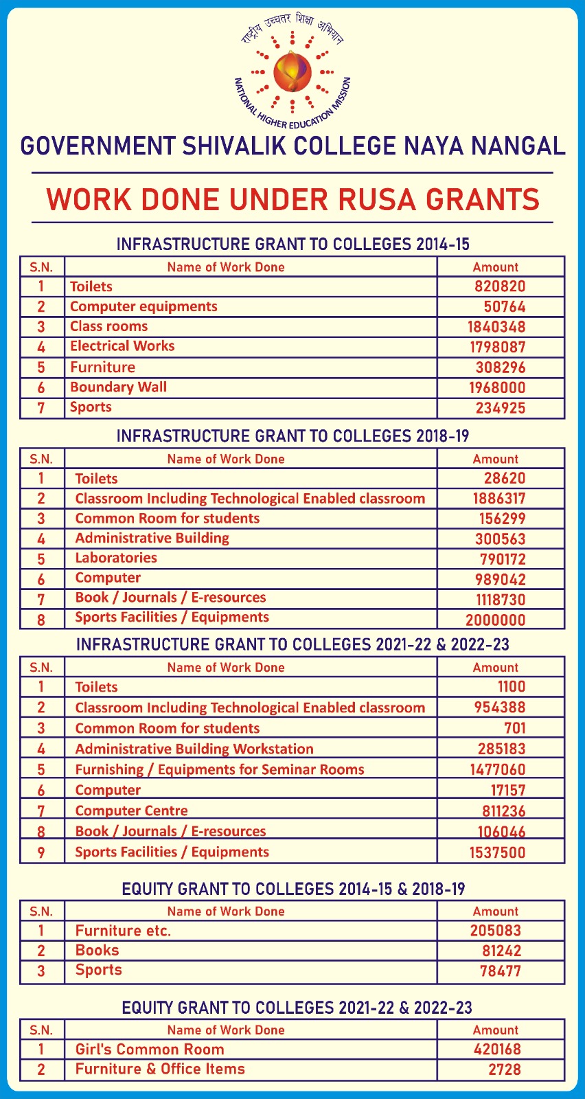 Under RUSA component, upgradation of existing colleges to model degree colleges, Government shivalikCollege was sanctioned Rs. 2 crores. The total funds released till date is Rs 20000000. The following projects have been completed under funds from RUSA